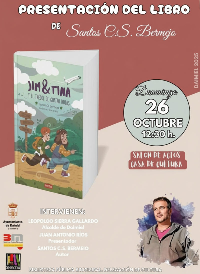 Presentación del libro "Jim & Tina y el trébol de cuatro hojas", de Santos C.S. Bermejo. En el acto, presentado por Juan Antonio Ríos, intervendrán el Alcalde de Daimiel Leopoldo Sierra y el autor Santos C.S. Bermejo.