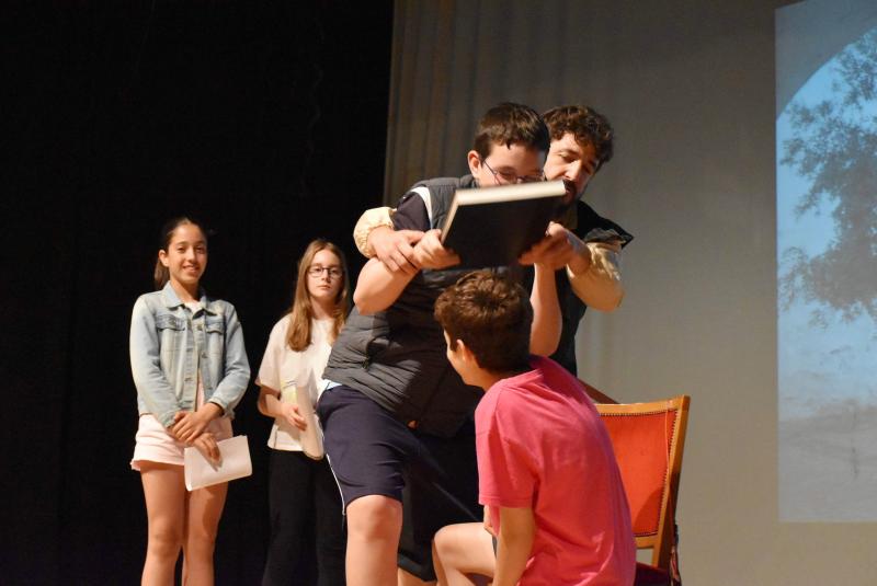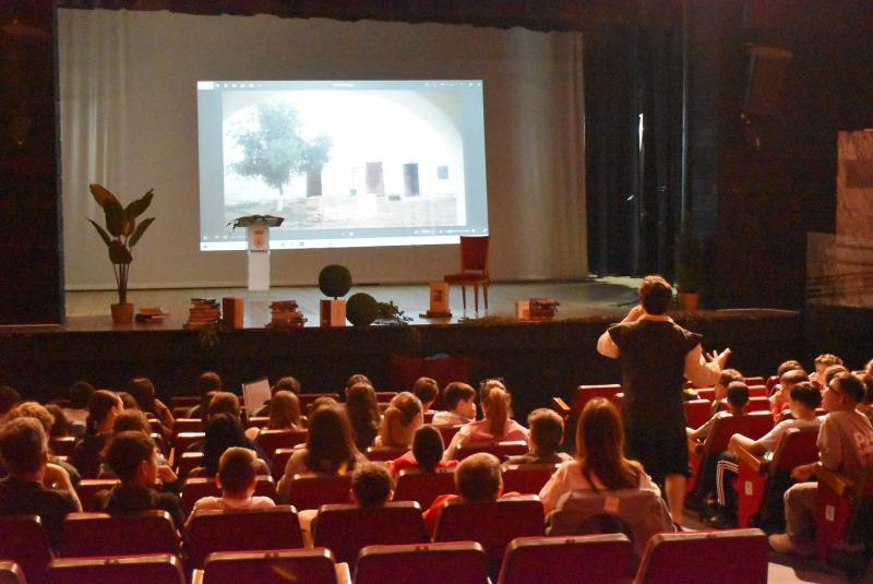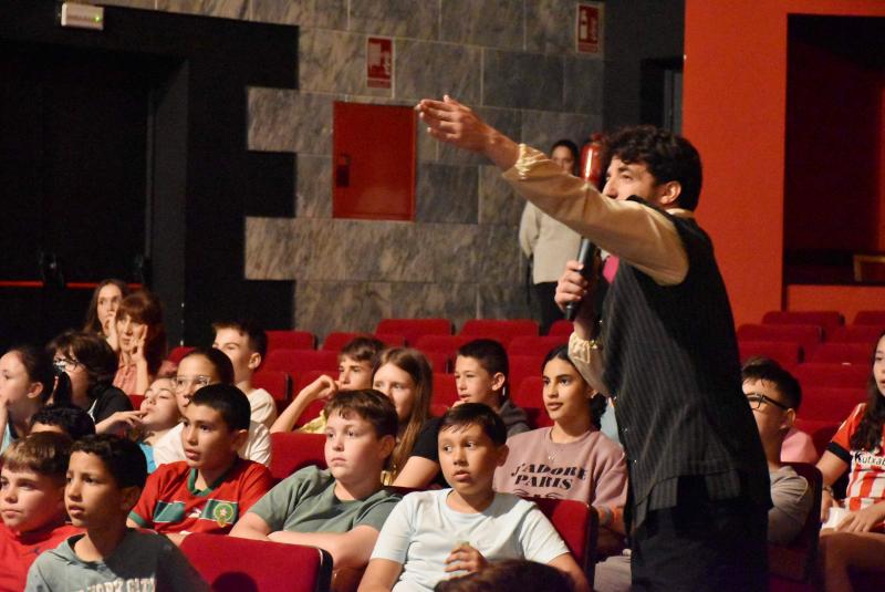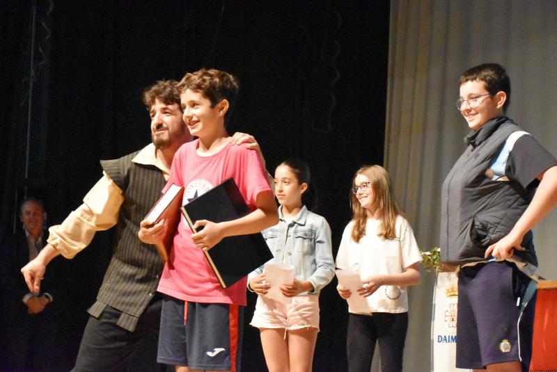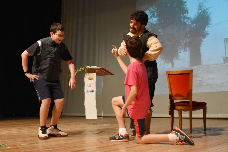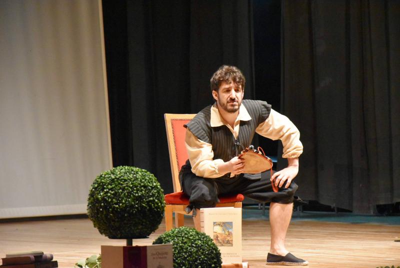 Encarnó al propio Cervantes y, a caballo entre la platea y el escenario, llevó a los alumnos por las dependencias de la venta daimieleña para acabar recreando, con la ayuda de varias de ellos, el pasaje donde fue armado caballero. Uno de los episodios más conocidos de El Quijote y que Cervantes pudo escribir inspirándose en la Venta de Borondo. Ya en pie, dio vida a las aventuras del ingenioso hidalgo y de su inseparable escudero Sancho Panza. Tras esta recreación y la de la lucha contra los molinos de viento, un atril con un ejemplar de El Quijote ocupó el centro del escenario.