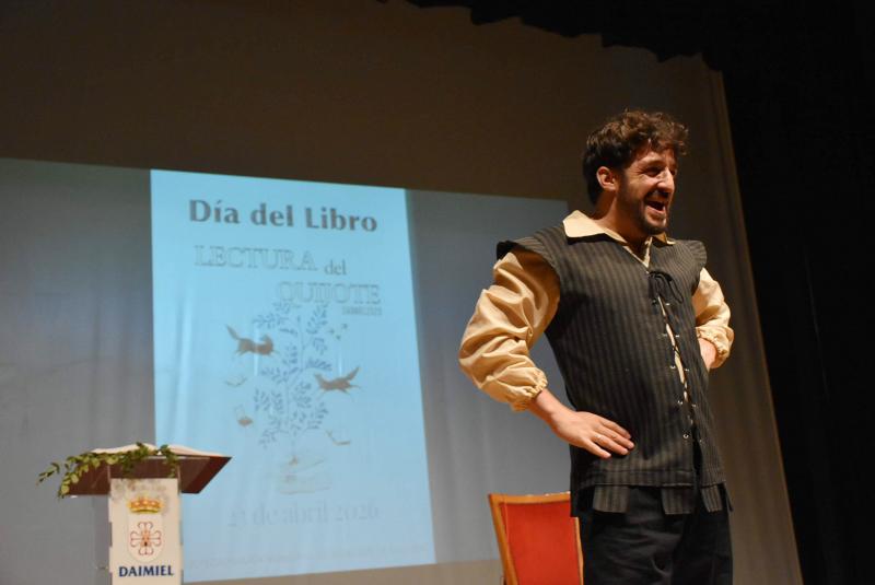 Una jornada de lectura colectiva donde antes se sumergieron en el universo de El Quijote gracias una ambientación teatralizada del actor Fran Gómez. Una recreación que ha incluido el pasaje de cómo fue armado caballero, uno de sus episodios más populares que Cervantes pudo escribir inspirándose en la daimieleña Venta de Borondo.