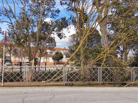 Precisamente en la Plaza se ha tenido que actuar. Primero, cerrando el acceso, y después, cortando las ramas del pino ubicado enfrente del bar Piscis, que desde primera hora de la mañana se vigilaba de cerca por riesgo evidente de caída. De hecho, a las once de la mañana ya había grietas visibles en la tierra del alcorque y en el pavimento, que indicaban su más que posible desprendimiento de raíz.