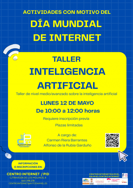Durante toda la semana, se desarrollarán actividades formativas como el taller de inteligencia artificial a cargo de la empresa iSystemProNet, que se celebrara el lunes 12 de mayo de 10:00 a 12:00 horas en el Centro de Internet.