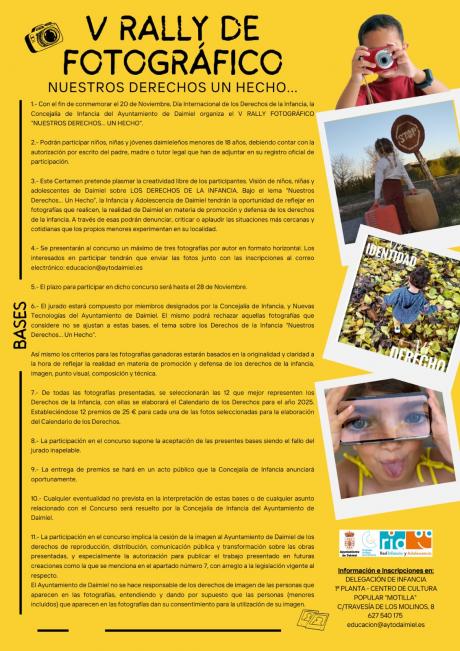 El rally fotográfico, invita a los menores de 18 años a capturar a través de su cámara la realidad de Daimiel desde la mirada infantil y juvenil, poniendo el foco en la promoción y defensa de los derechos de los niños y los jóvenes. Los participantes podrán enviar hasta tres fotografías en formato horizontal antes del 28 de noviembre al correo educacion@aytodaimiel.es.