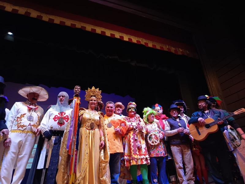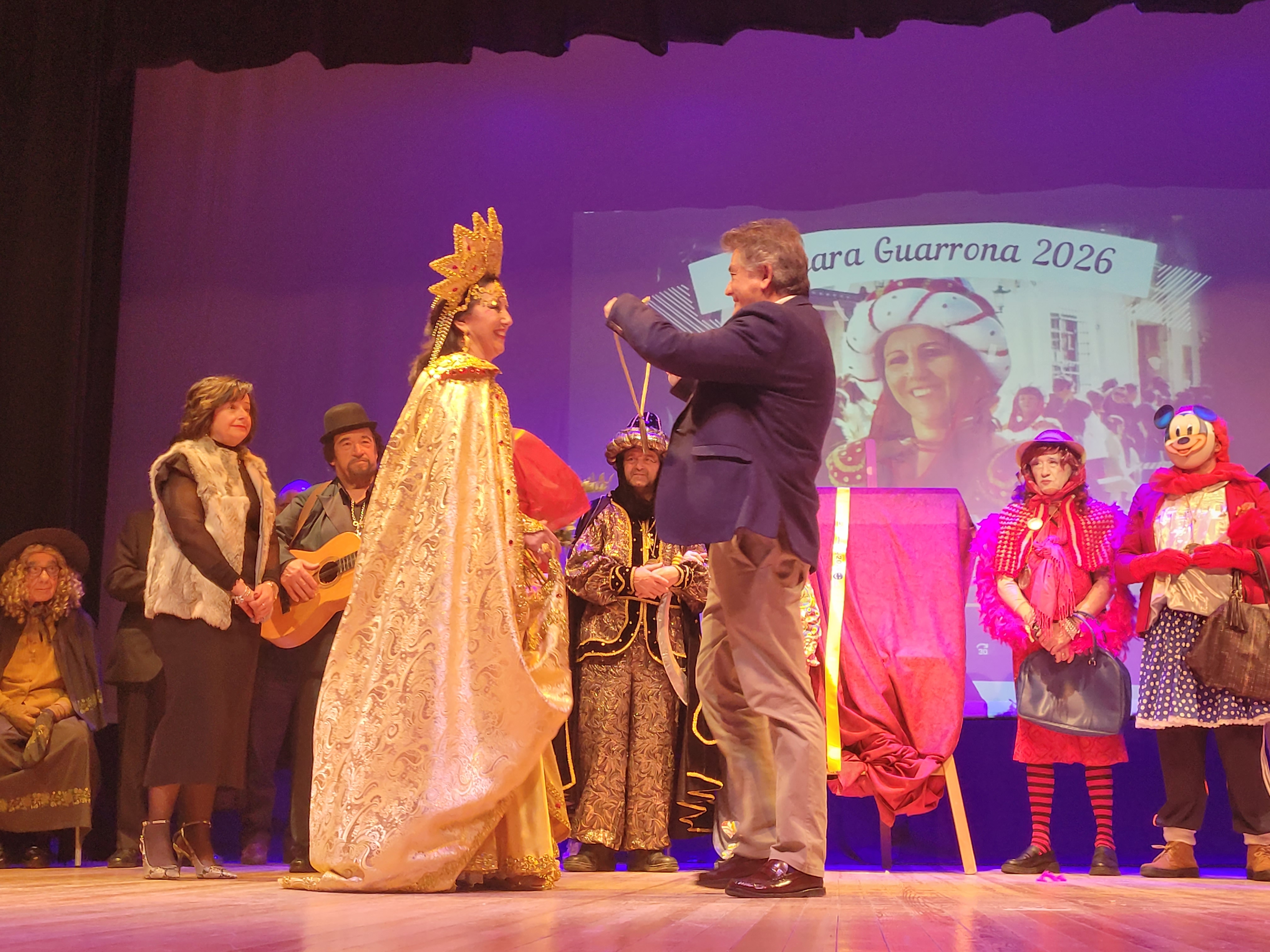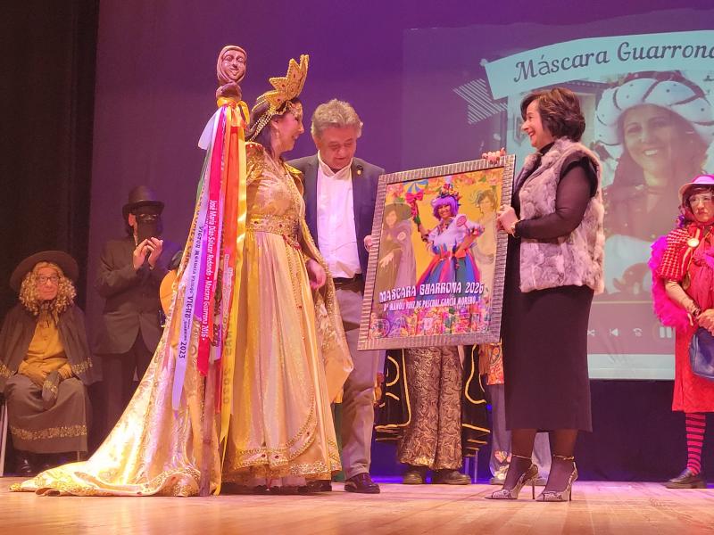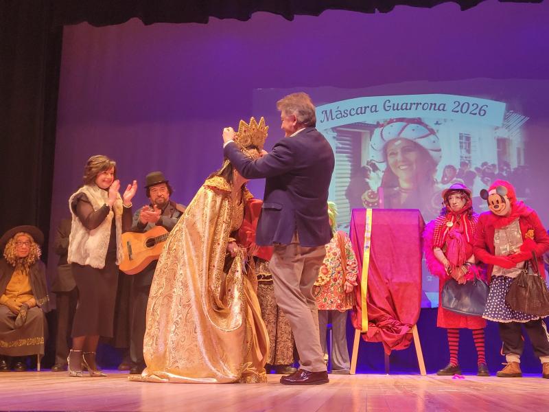 A continuación, el alcalde impuso a Manoli Ruiz el medallón acreditativo, mientras que la Máscara Guarrona 2025, Manuel Molina Sánchez de Pablo, le entregó el bastón, al que la concejal de Festejos colocó la cinta oficial. El reconocimiento se completó con la entrega de un cuadro conmemorativo. El escenario se llenó entonces de historia viva del carnaval, con la presencia de todas las Máscaras Guarronas desde 1998 hasta la actualidad, con palabras de recuerdo también a aquellas ya fallecidas.