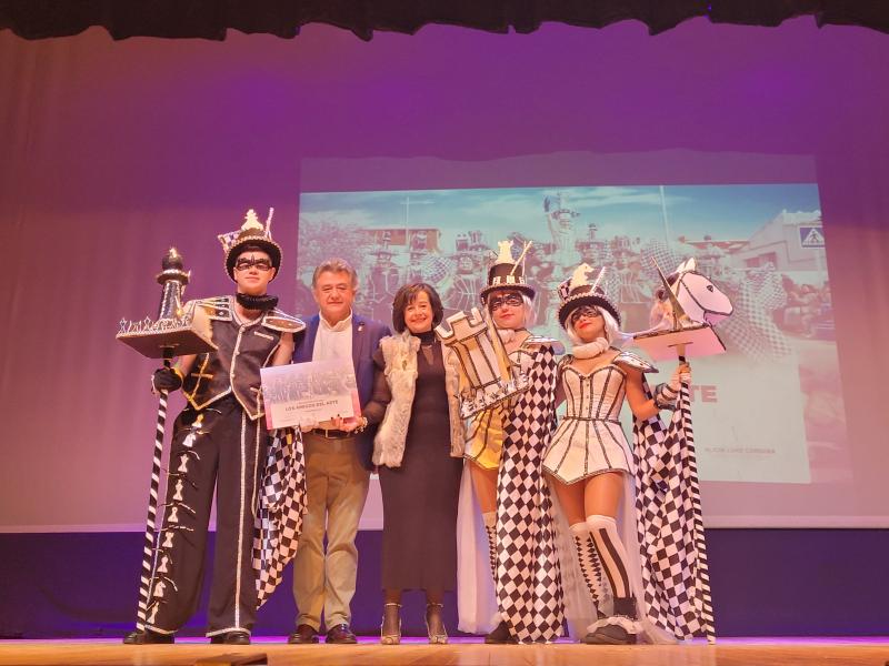 Tras los reconocimientos, el escenario acogió la presentación de algunos de los nuevos trajes que lucirán las asociaciones y peñas en el gran desfile del próximo domingo. Amigos del Arte mostró su propuesta “Jaque Mate”, inspirada en el ajedrez, con trajes de torre, caballo y alfil; mientras que la Peña El Cencerro sorprendió con “Misterios del Mar Profundo”, una fantasía marina llena de color y creatividad. Los premios fueron entregados por el alcalde y la concejal de Festejos.