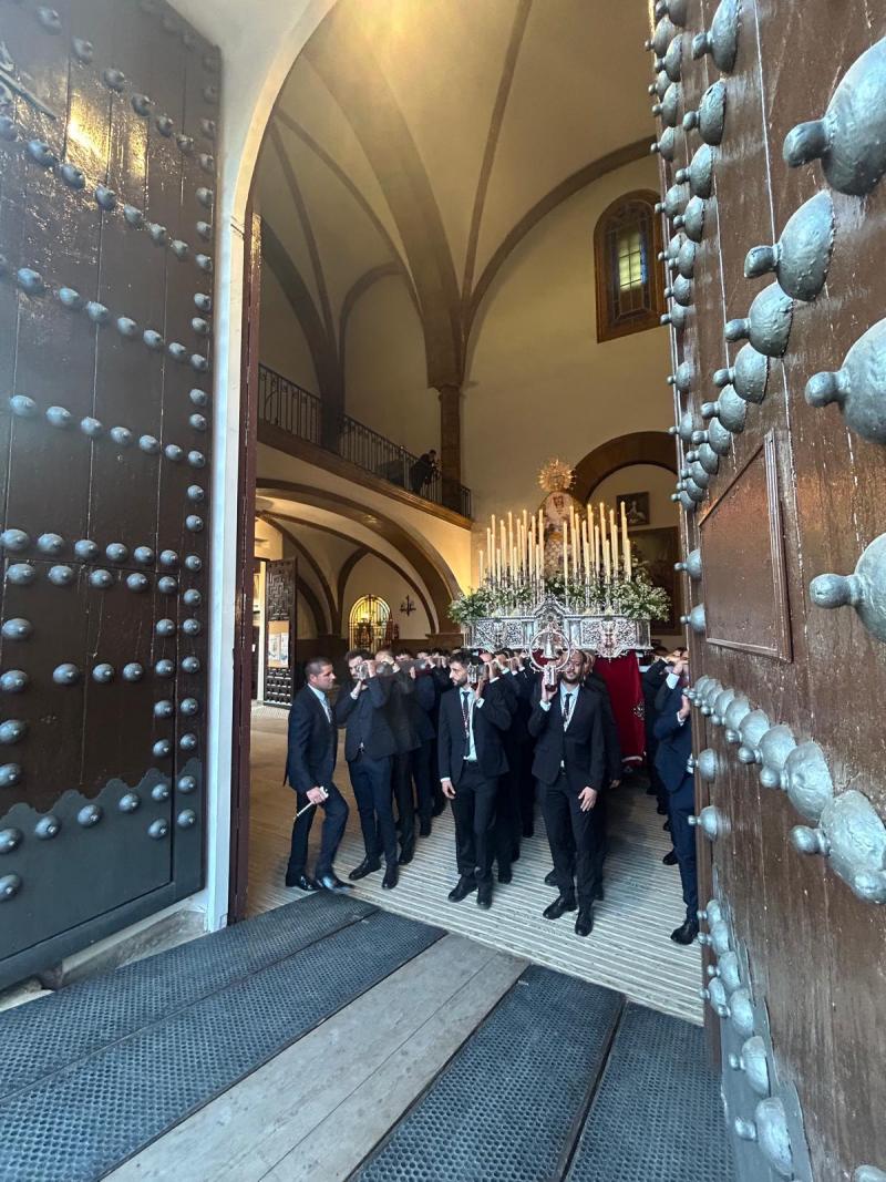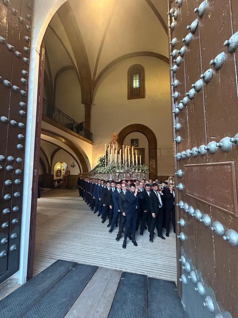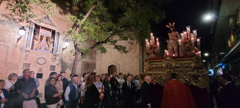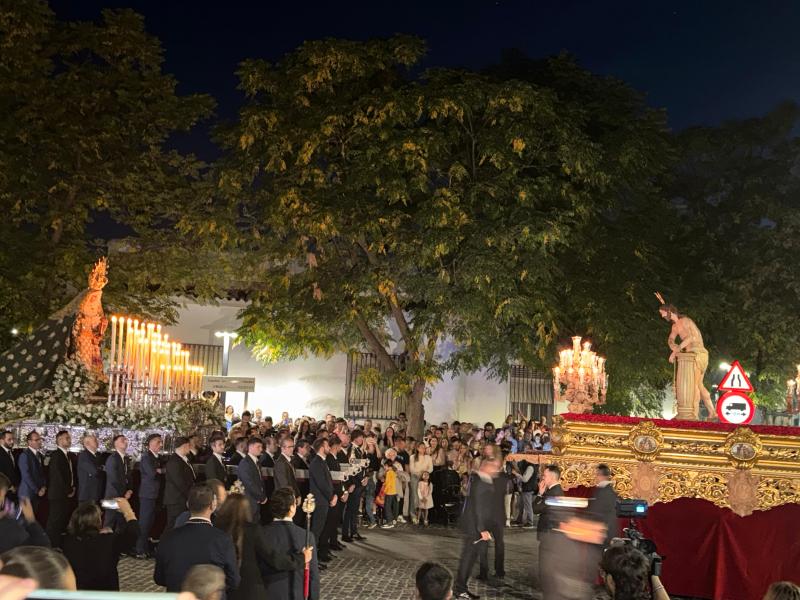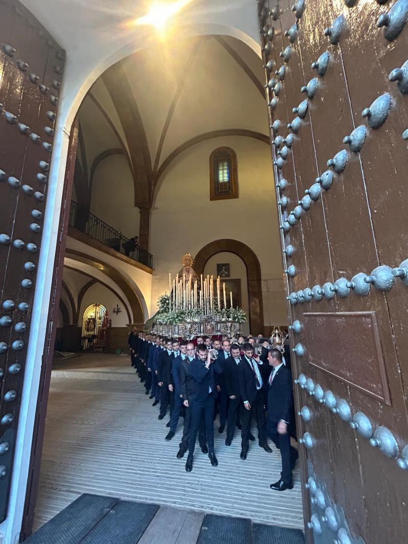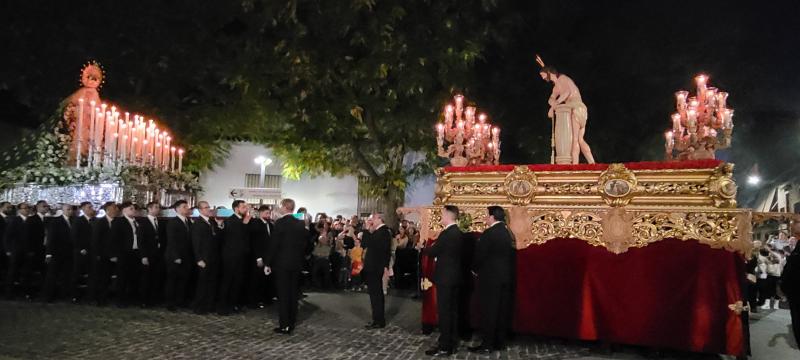 Momentos antes, el cortejo hizo una breve parada en la sede de la Hermandad del Santísimo Cristo del Sepulcro, donde el Cristo de la Columna se detuvo ante la imagen titular de la corporación, situada en la puerta en señal de respeto y hermandad entre cofradías.