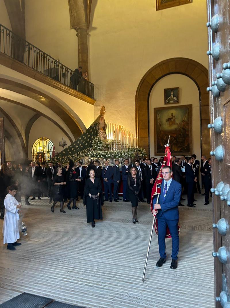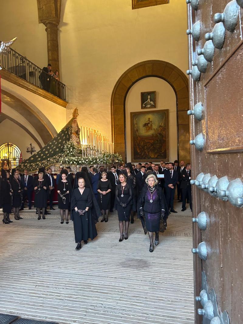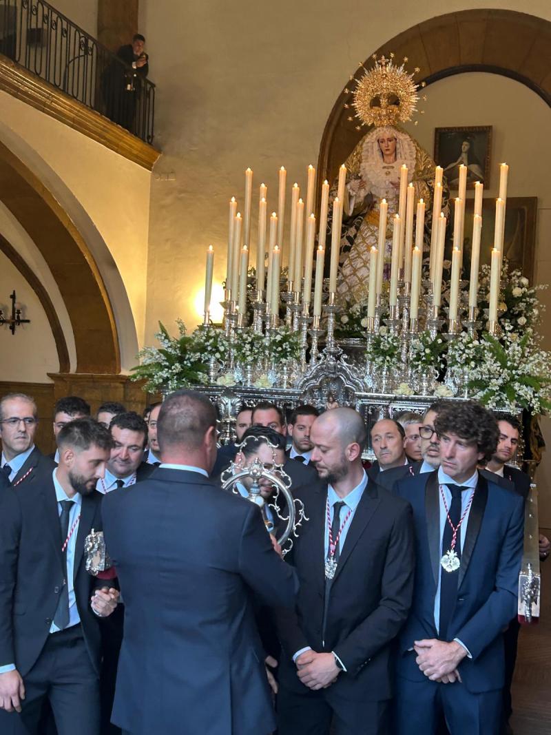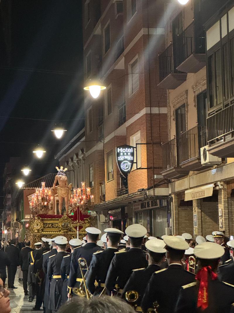 Momentos antes, el cortejo hizo una breve parada en la sede de la Hermandad del Santísimo Cristo del Sepulcro, donde el Cristo de la Columna se detuvo ante la imagen titular de la corporación, situada en la puerta en señal de respeto y hermandad entre cofradías.