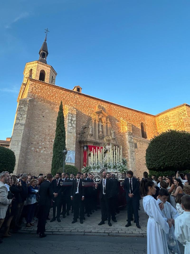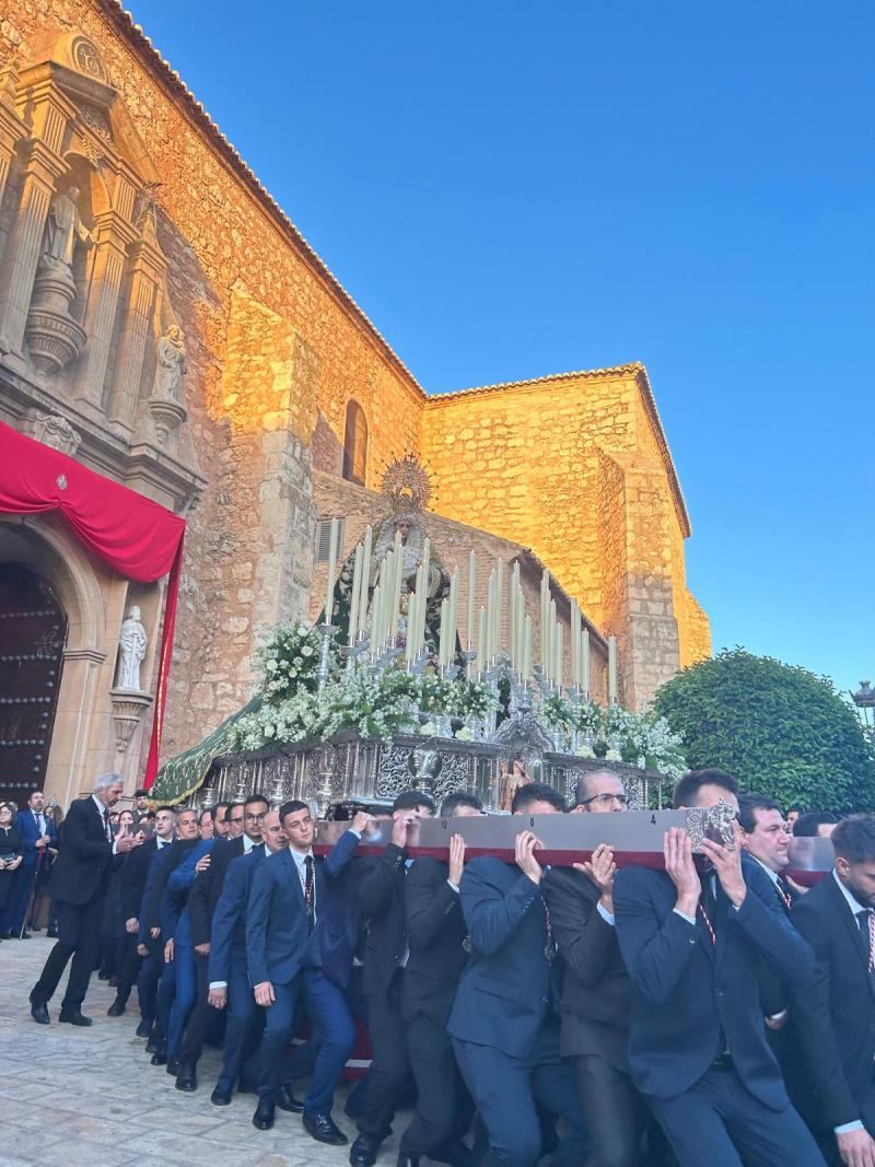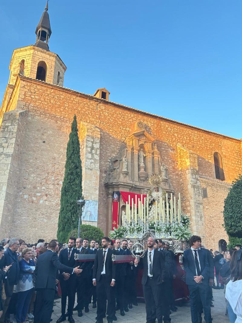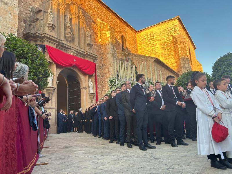 Otro de los puntos más simbólicos del recorrido fue el convento de Las Mínimas, donde la imagen del Cristo se detuvo ante el mural de la Virgen de las Cruces, patrona de Daimiel. En ese mismo lugar, el vicario parroquial de San Pedro, Jacinto Naharro, dirigió unas emotivas peticiones ante los devotos y hermanos de la cofradía.