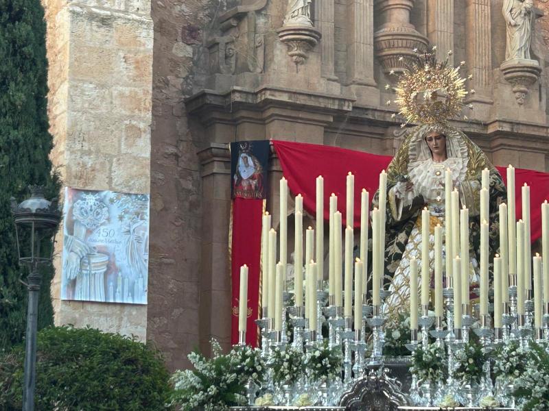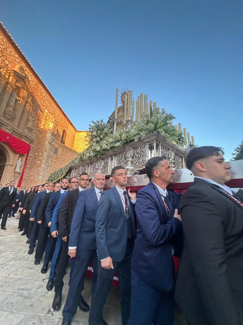 Ya en la calle Virgen de las Cruces, el cuarteto Staccato volvió a acompañar con su música el paso de la procesión frente a la casa de José Martínez Guerrero, hermano mayor ya fallecido, en un gesto de recuerdo y homenaje. Desde varios balcones, los vecinos lanzaron pétalos a la Virgen de la Amargura, en una sentida petalá que tiñó el aire de emoción y devoción.