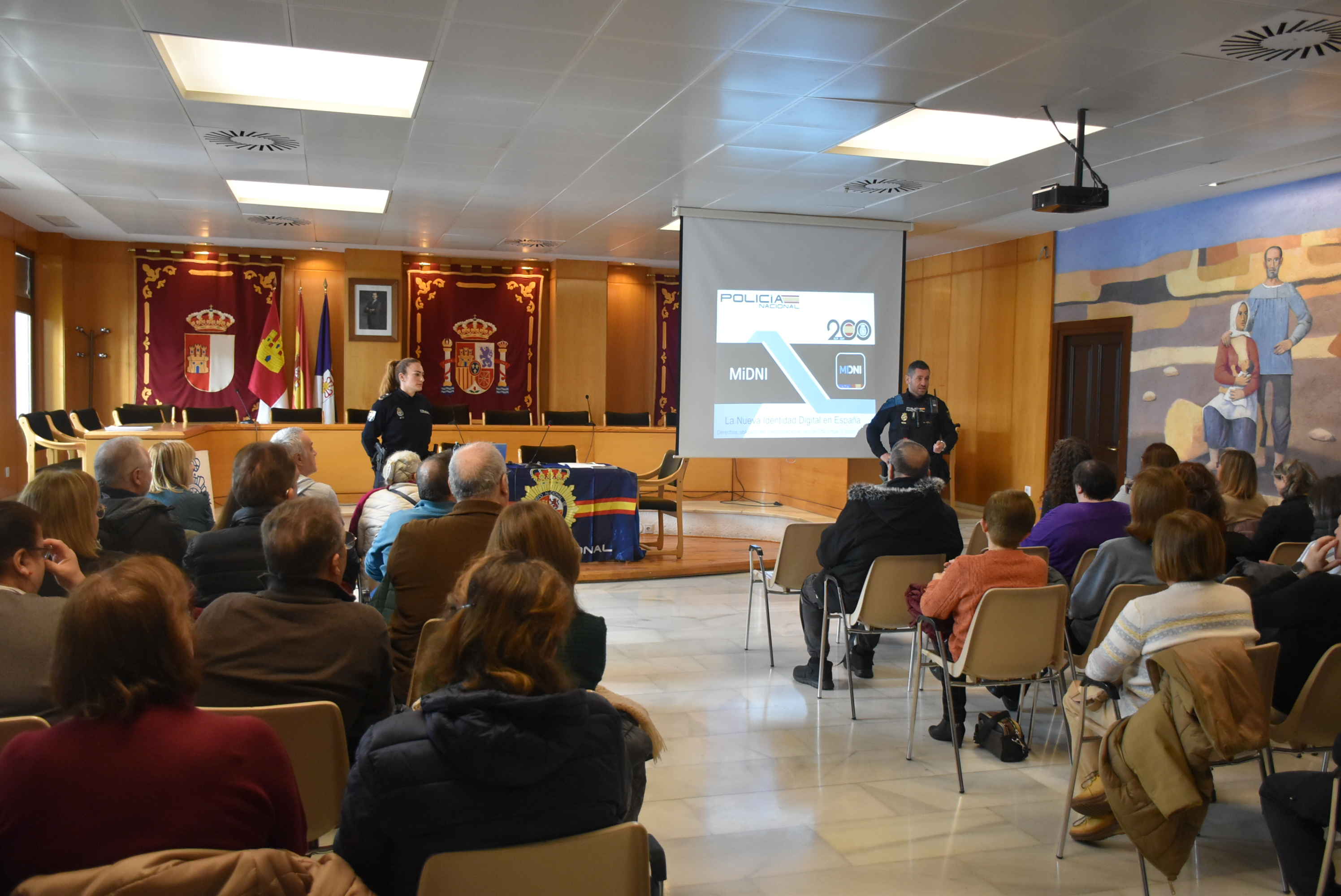 Por su parte, la delegada de Participación Ciudadana, Pilar Chacón, fue la encargada de dar la charla en el Salón de Plenos del Ayuntamientos. Chacón presentó la aplicación MiDNI, que permite identificarse digitalmente de forma segura, mostrar solo datos parciales cuando sea necesario y reducir el riesgo de suplantación de identidad. Para su uso, el documento debe estar en vigor y vinculado al dispositivo móvil a través del punto de actualización biométrica disponible en el Consistorio.