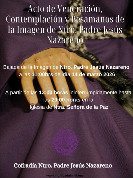 El sábado 14 de marzo cobrará especial relevancia la imagen de Jesús Nazareno, titular de los Moraos. El acto de su bajada desde el altar se iniciará a las 11:00 horas, seguido del rezo del Vía Crucis.