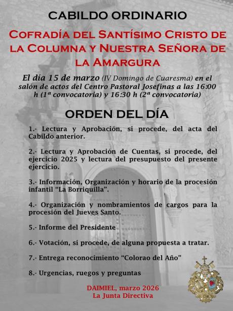 Daimiel Noticias.– La agenda cofrade de Daimiel encara el cuarto domingo de Cuaresma con una programación repleta de cultos, actos formativos y tradiciones populares. La actividad comienza hoy, viernes 13 de marzo, con el segundo día del triduo en honor a Nuestra Señora de la Amargura en la parroquia de San Pedro a las 19:00 horas. Mientras, en la parroquia de Santa María, tras la Eucaristía de las 19:30 horas, se rezará el Santo Vía Crucis bajo el título ‘El camino hacia la cruz’.