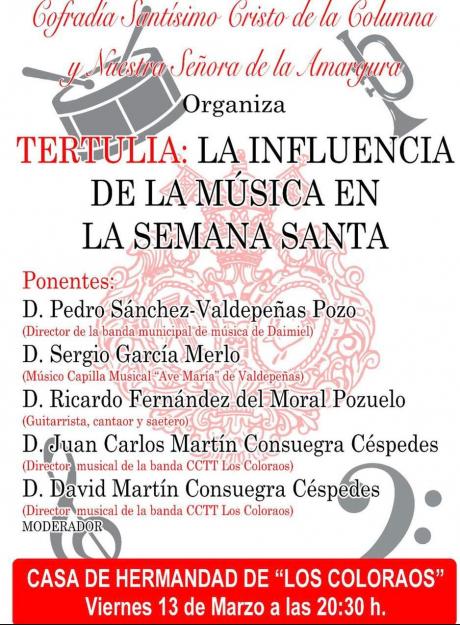 La jornada concluirá con una vertiente cultural a las 20:30 horas en la Casa de Hermandad de los Coloraos, donde se celebrará una tertulia sobre la influencia de la música en la Semana Santa con ponentes locales, entre ellos, el guitarrista y cantaor Ricardo Fernández del Moral o los directores de la Banda Municipal de Música y de la banda de cornetas y tambores de la cofradía.
