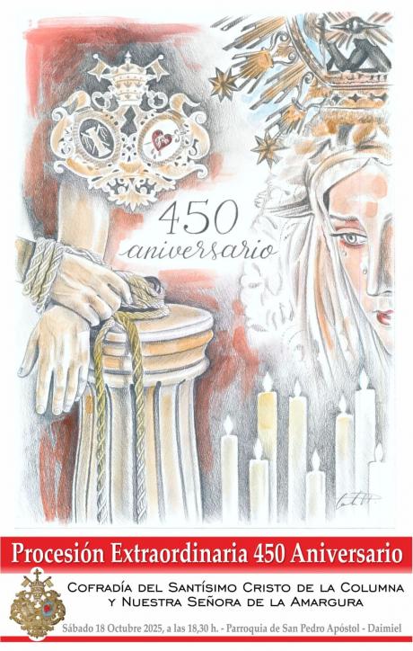 La Cofradía del Santísimo Cristo de la Columna y Nuestra Señora de la Amargura continúa con la programación especial de su 450 aniversario con dos citas destacadas en el mes de octubre: la inauguración de una exposición conmemorativa en el Casino de la Armonía y la procesión a costal del Cristo de la Columna desde la parroquia de San Pedro, un acontecimiento inédito en la historia cofrade daimieleña.