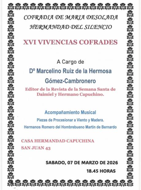 Este año, el ponente es Marcelino Ruiz de la Hermosa Gómez-Cambronero, hermano capuchino, expresidente de la Hermandad del Santo Sepulcro y editor de la revista de Semana Santa de Daimiel. Lo presentará Irene Córdoba Ráez y contará con el acompañamiento musical de viento y madera de los hermanos Romero del Hombrebueno.
