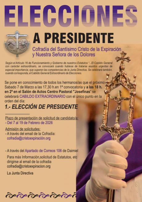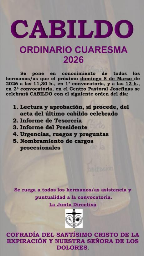 En el plano institucional, la cofradía del Santísimo Cristo de la Expiración y Nuestra Señora de los Dolores ha convocado para este sábado cabildo extraordinario en el salón de actos del Centro Pastoral Josefinas