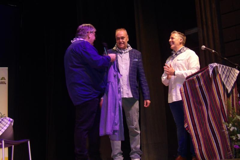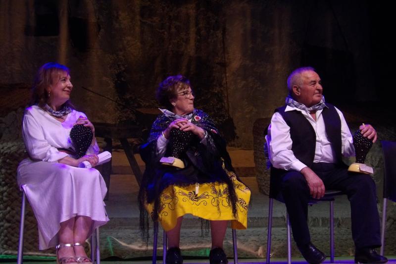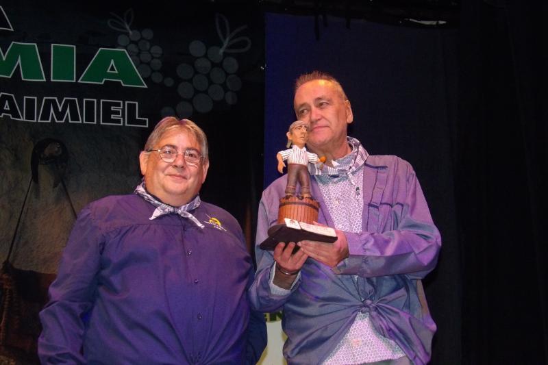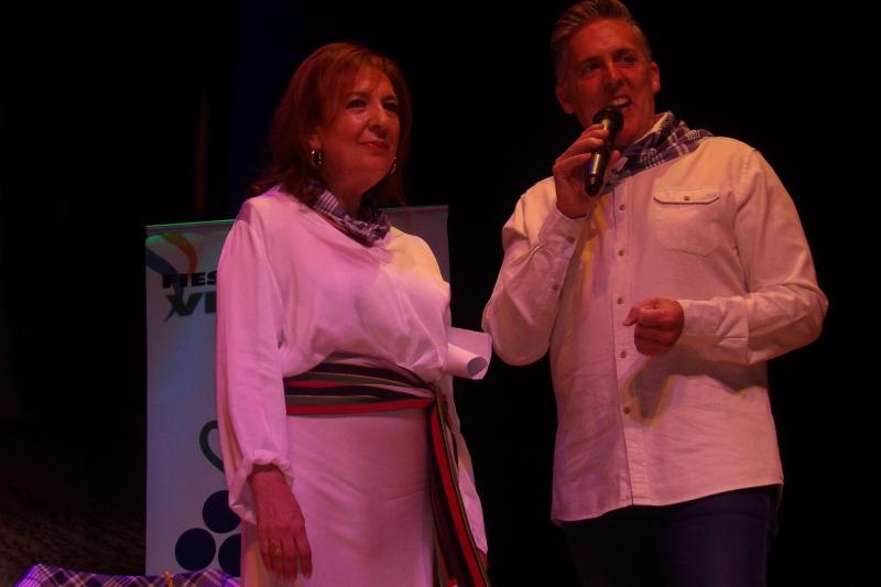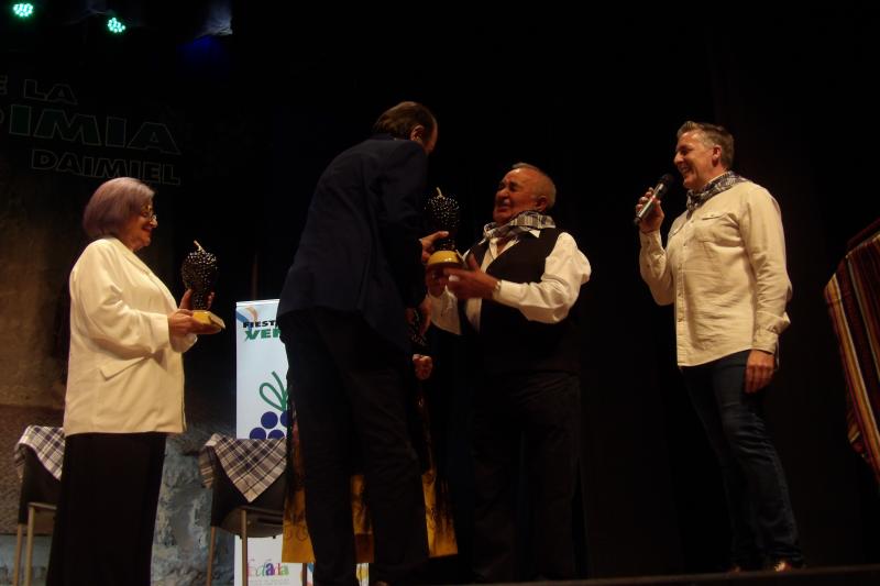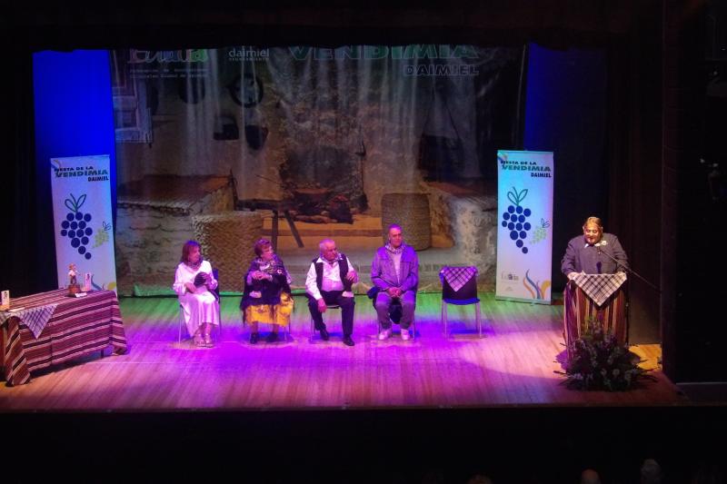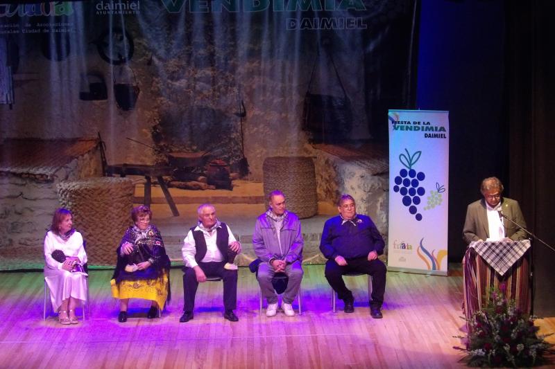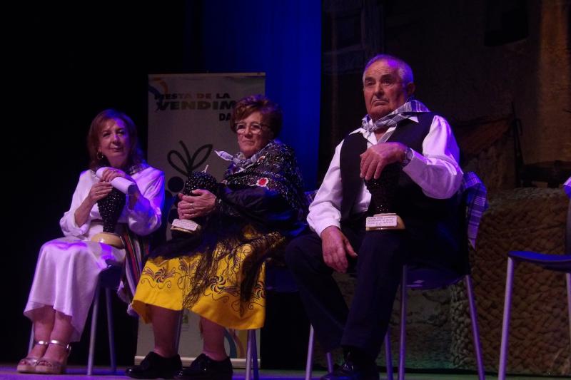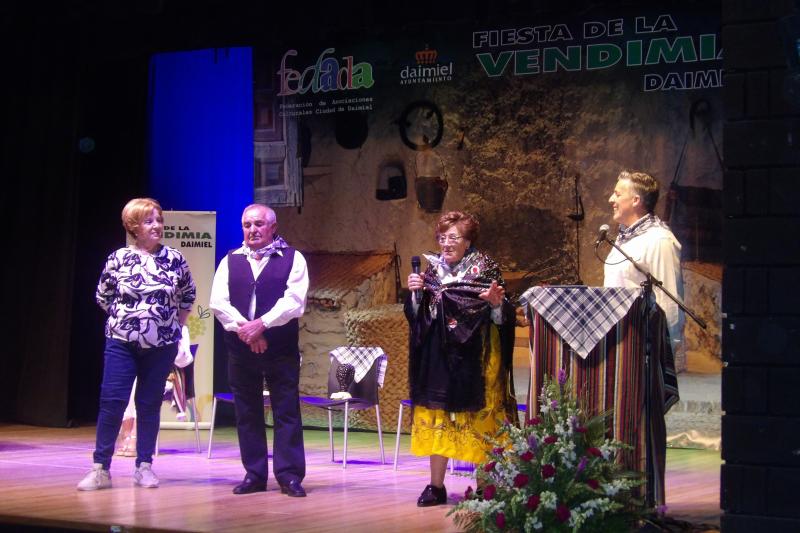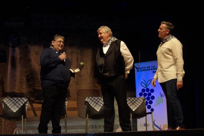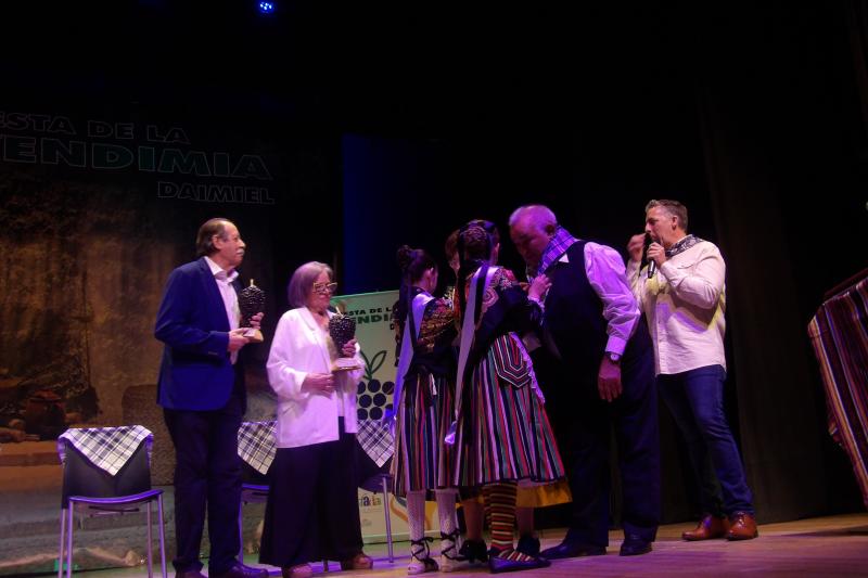 Durante el acto, que este año estuvo presentado por Raúl Astillero, FEDADA hizo entrega de los reconocimientos honoríficos al matrimonio formado por Manuel Gómez Caraballo Córdoba, apodado ‘El Mellao’, y Encarnación Díaz del Campo Villegas, ambos participantes entusiastas de las fiestas de la vendimia y de las celebraciones más populares daimieleñas. Los dos quisieron trasladar su agradecimiento a la organización y conversaron con el presentador acerca de su historia y sus vivencias en Daimiel. Y también Teo Martínez, profesional natural de Ciudad Real con más de 40 años de experiencia en medios de comunicación, subió al escenario del Ayala para recibir el galardón y ponerse el tradicional blusón.“Es todo un honor para mí”, dijo mientras bromeaba acerca del esfuerzo que supone ir a vendimiar “a las 5 de la mañana”.