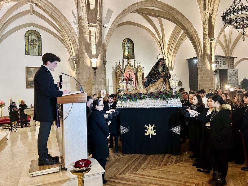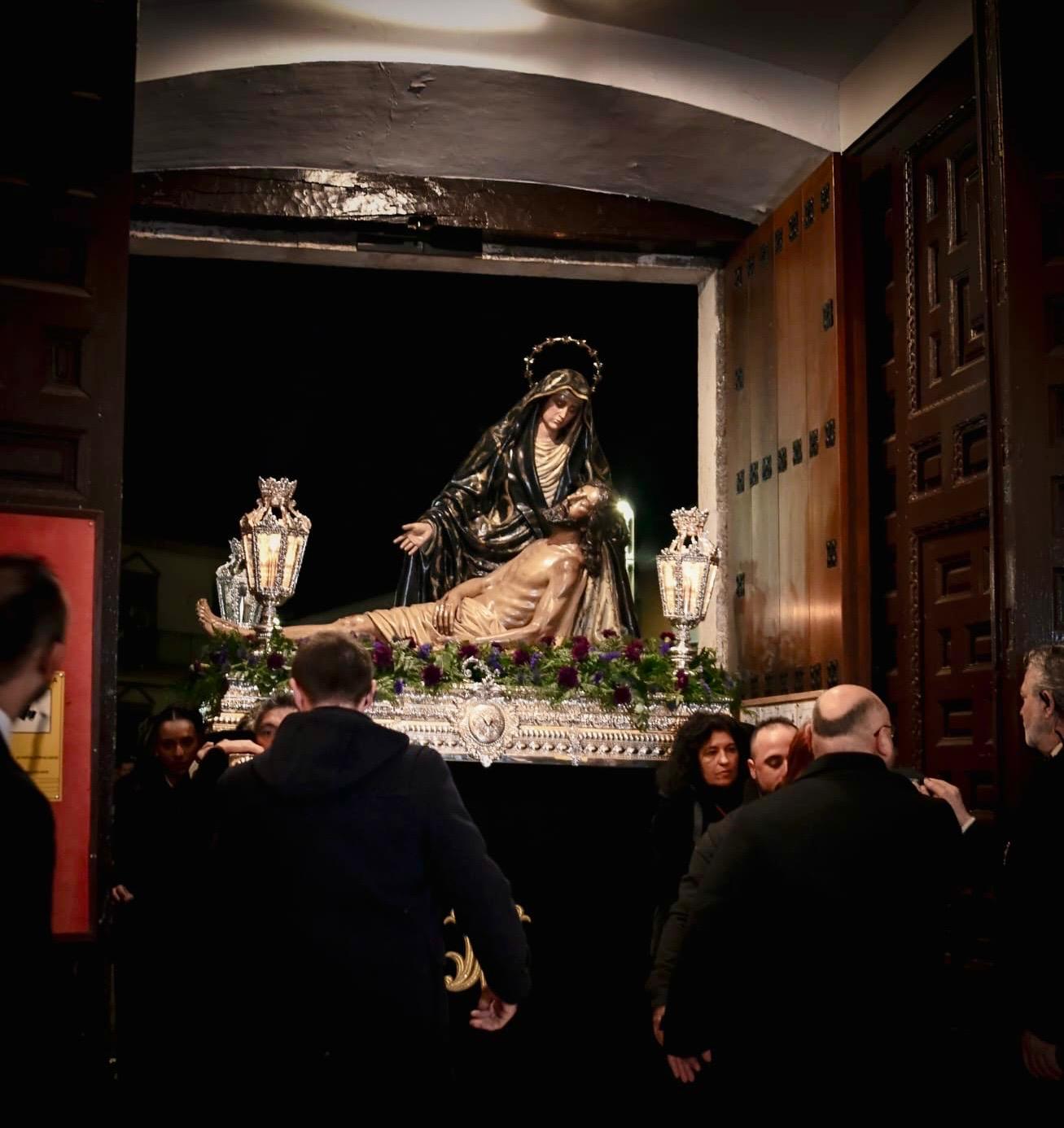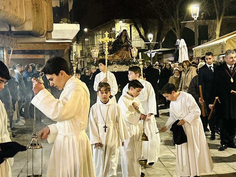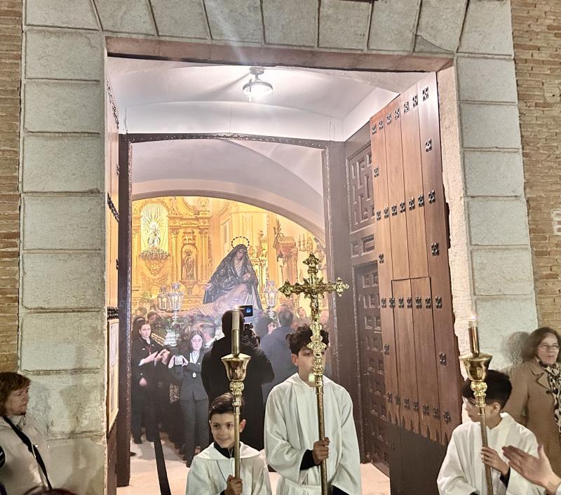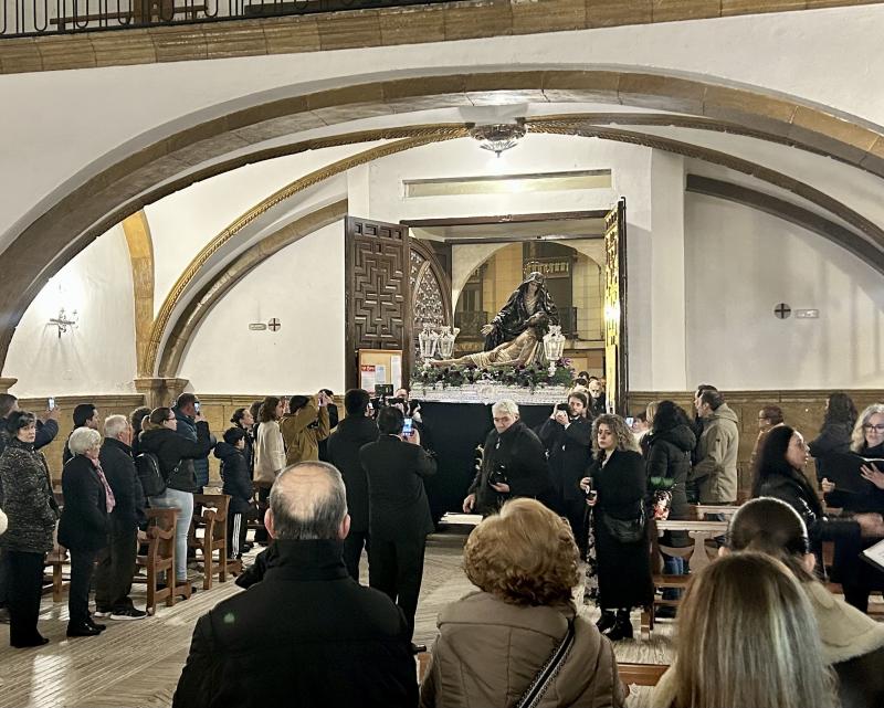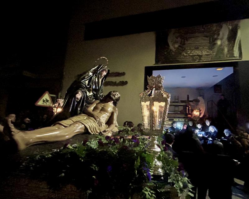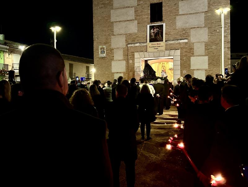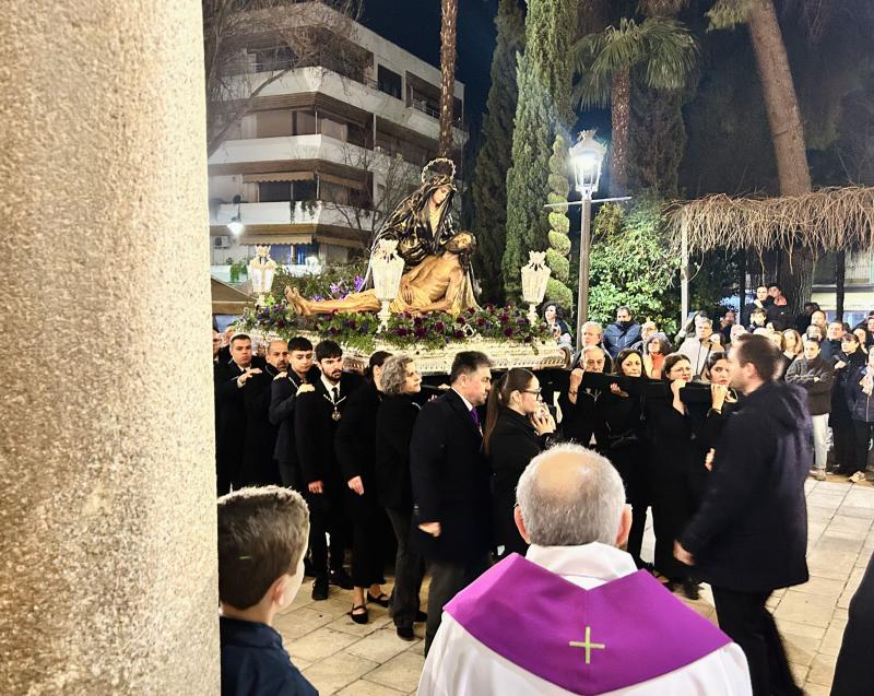 Daimiel Noticias.- Daimiel vivió este sábado una noche de fe y profundo sentimiento cofrade con la celebración del solemne Vía Matris de la Junta de Hermandades de la localidad. La imagen de La Piedad, perteneciente a la hermandad del Santísimo Cristo del Sepulcro ('Los Negros'), presidió el cortejo, dejando estampas históricas, ya que, por primera vez, se adentró en el interior de la iglesia de Santa María y en la ermita de la Paz. Allí, la imagen quedó frente al altar de Jesús Nazareno, en un instante cargado de simbolismo y emoción, en el que se rezó el Dolor correspondiente con el acompañamiento de las voces del coro de cámara Laminium.