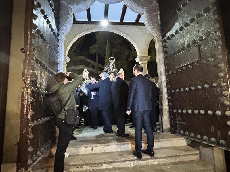 El itinerario dejó momentos y estampas inéditas. Por primera vez, el cortejo se adentró en el interior de la iglesia de Santa María y en la ermita de la Paz, donde la imagen quedó frente al altar de Jesús Nazareno, en un instante cargado de simbolismo y emoción. La Virgen fue portada a hombros por relevos de 24 hermanos de las hermandades de Pasión, Gloria y Sacramentales, en esta cita promovida por la Junta de Hermandades.