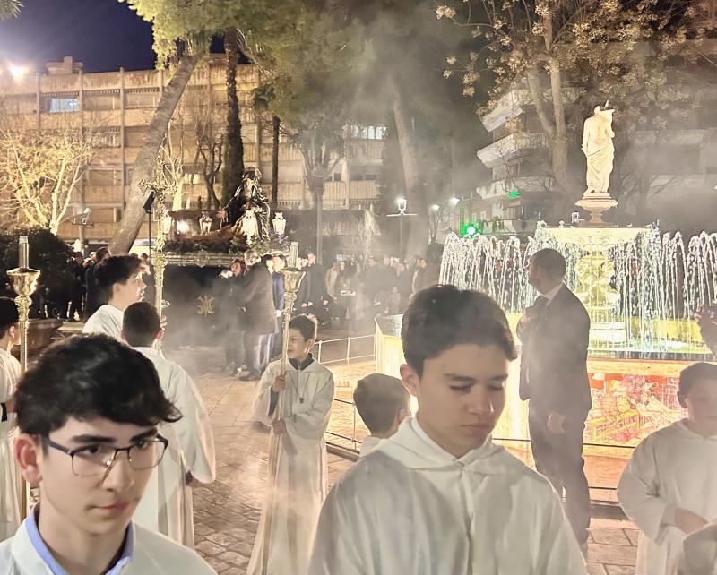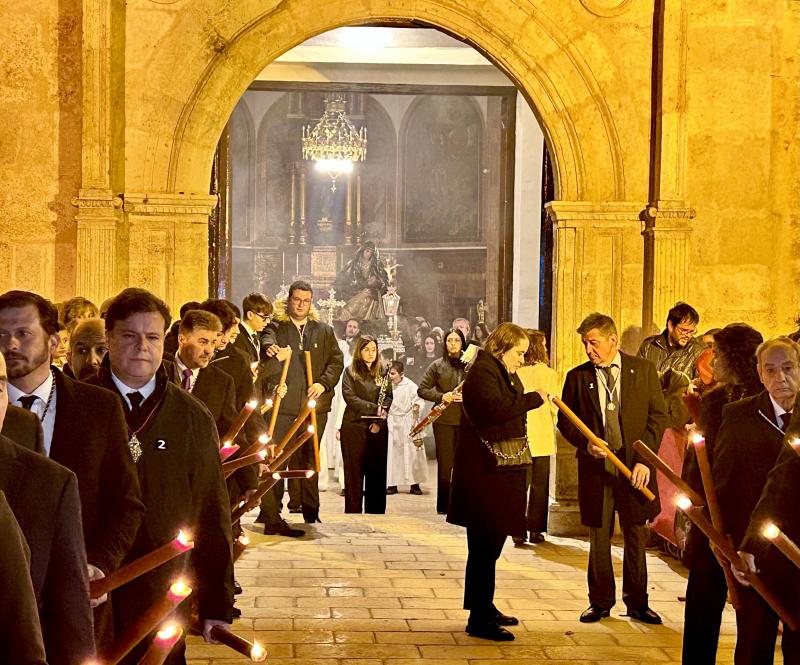Bajo un cielo apacible y en un ambiente de respeto, más de un centenar de cofrades y religiosos acompañaron durante todo el recorrido alumbrando con cirios de vela natural, en un silencio que solo se veía interrumpido por la música del trío de capilla y el rezo de los Dolores. Sobriedad y recogimiento, con otros momentos destacados como en la calle Jesús, donde se abría la casa de hermandad de 'Los Moraos' con sus atributos al paso de la misma. Asimismo, conmovió el canto de las monjas Mínimas cuando la procesión recorría la calle del convento, o su paso por la calle Nueva, sede de la casa de la hermandad anfitriona, donde le esperaba el paso de su titular, el sepulcro vacío.