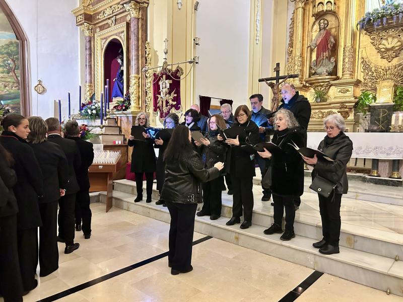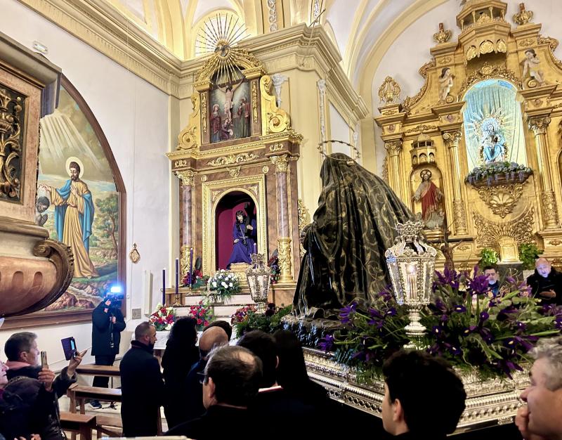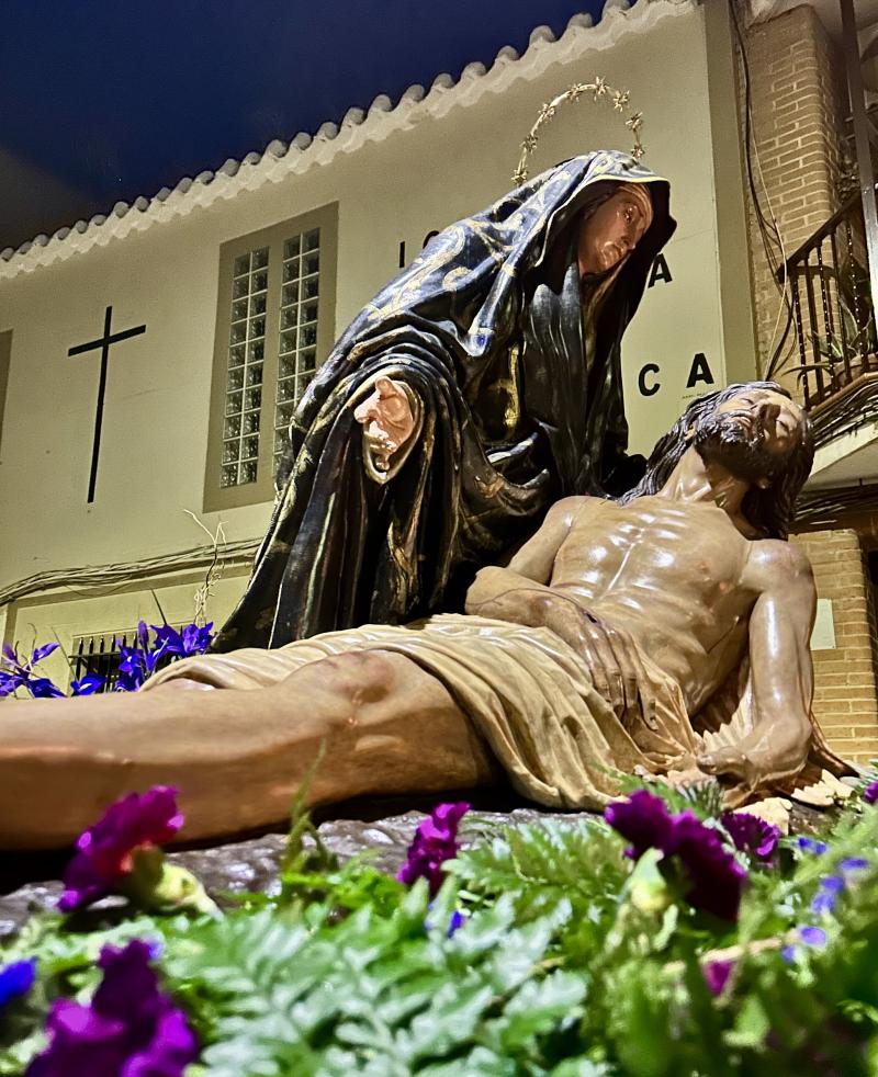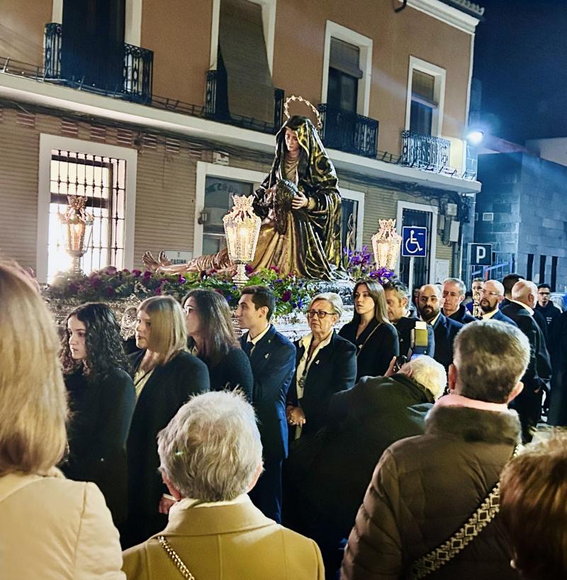 La imagen fue portada a hombros por cuatro relevos compuestos por 24 hermanos procedentes de las distintas cofradías y hermandades de Pasión, y también de Gloria y Sacramentales, escenificando la unión del mundo cofrade daimieleño en torno a la Madre. La Piedad procesionó en el trono que suele utilizar la hermandad de María Desolada en el domingo de Resurrección, lo que dotó al Vía Matris de un cariz diferente. Ambiente de recogimiento y oración en esta cita que cada año organiza la JJHH en el segundo fin de semana de Cuaresma, y que daba comienzo en la parroquia de San Pedro con el rezo ante el Santísimo y la bendición de todos los hermanos por parte del vicario Jacinto Naharro.