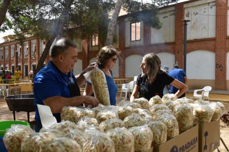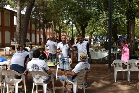 La mañana transcurrió entre juegos y aperitivos en las mesas de las peñas. Mientras tanto, la asociación de vecinos del barrio de San Isidro se encargó de preparar unas 380 raciones de migas que compartieron en hermandad, mezclándose los colores de las camisetas de cada una de las agrupaciones en los sitios que tienen reservados.