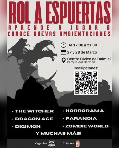 La asociación de ocio alternativo juvenil y cultural Puerta de Hades organiza los días 27 y 28 de marzo en el centro cívico El Carmen una nueva edición de las jornadas ‘Rol a Espuertas’, una actividad gratuita dirigida a jóvenes a partir de 14 años y sin límite de edad.
